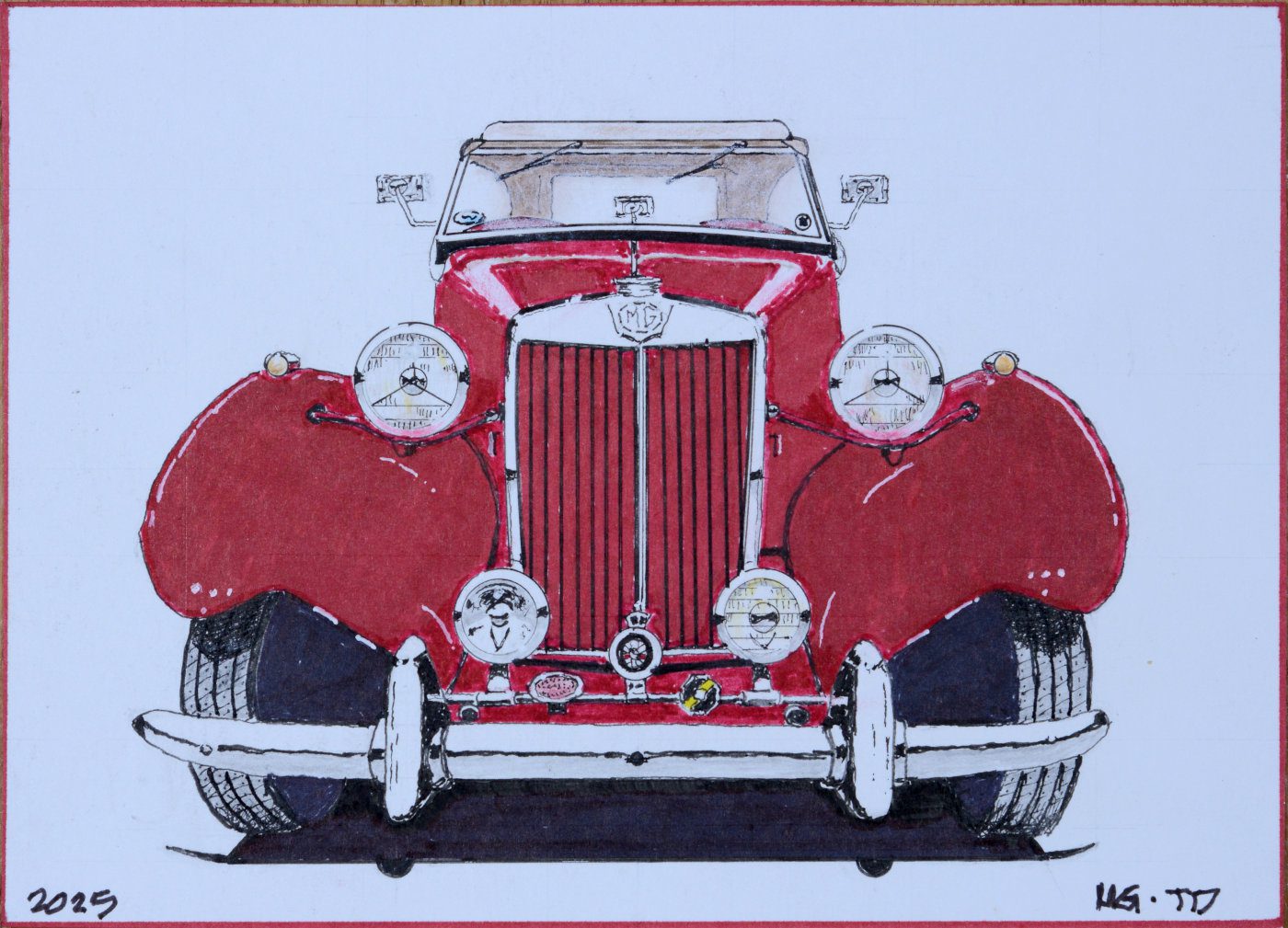 In this pen & ink and watercolor work, Gans was exploring the intricate grill work of this MG-TD. The four headlamps seem to be staring out at you as you admire the car.